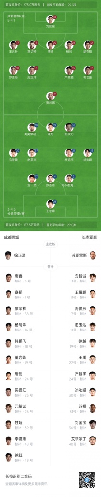 09月12日讯 19点35分中超第24轮,成都蓉城主场迎战长春亚泰。蓉城方面韦世豪、费利佩、周定洋出战,亚泰方面2外援先发,谭龙、彭欣力首发。
